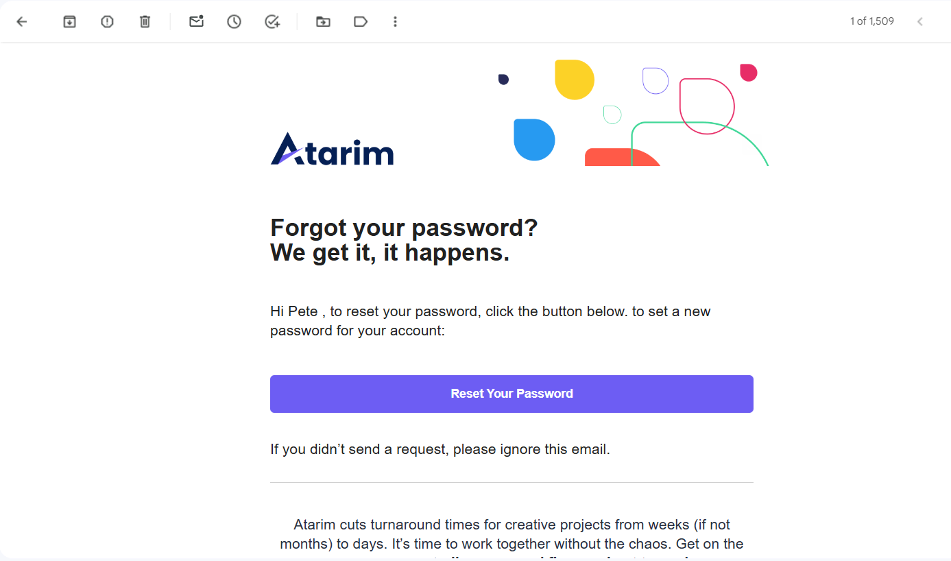 Look for an email from Atarim with the subject line related to password recovery. This email will contain a secure link or instructions to reset your password.