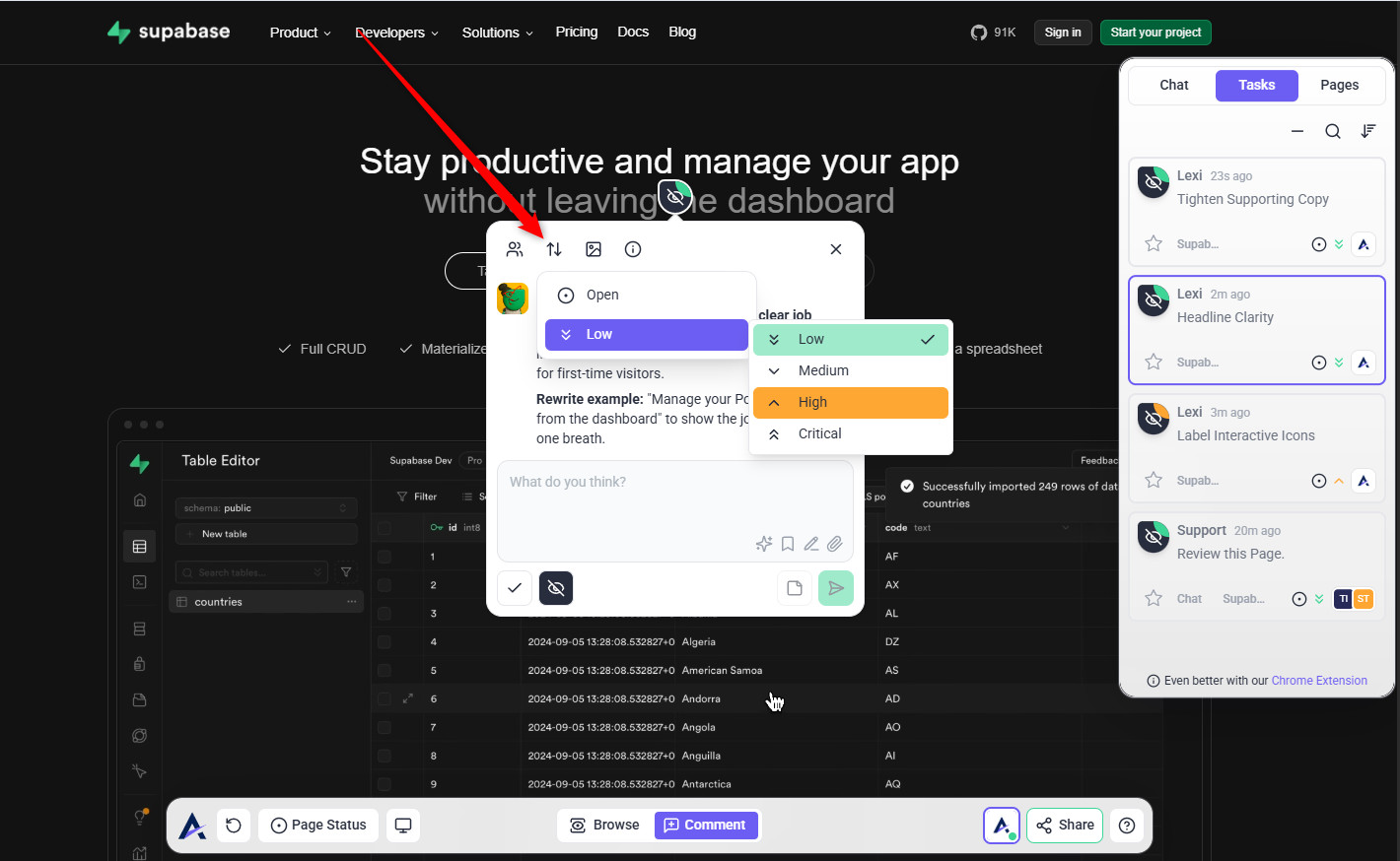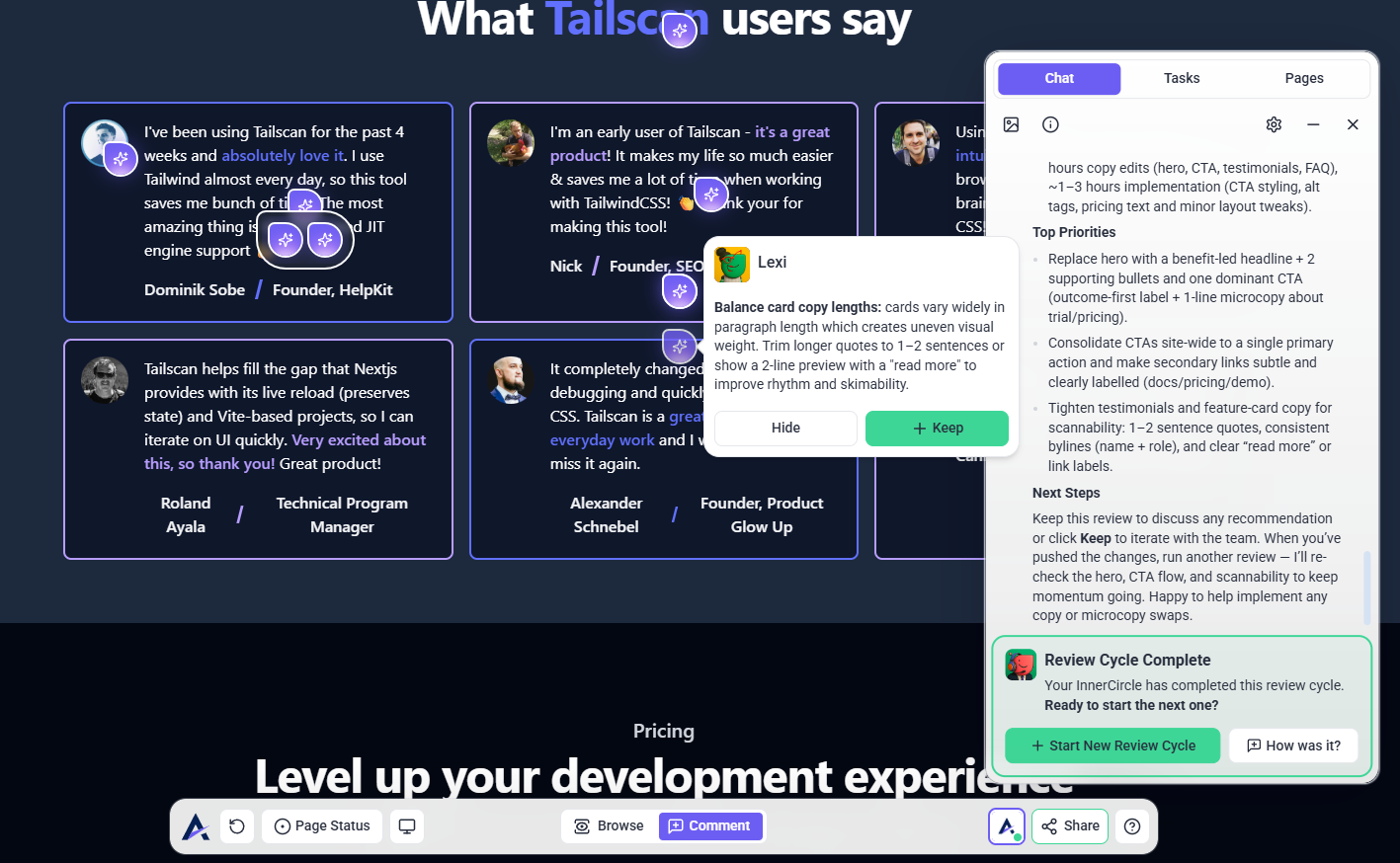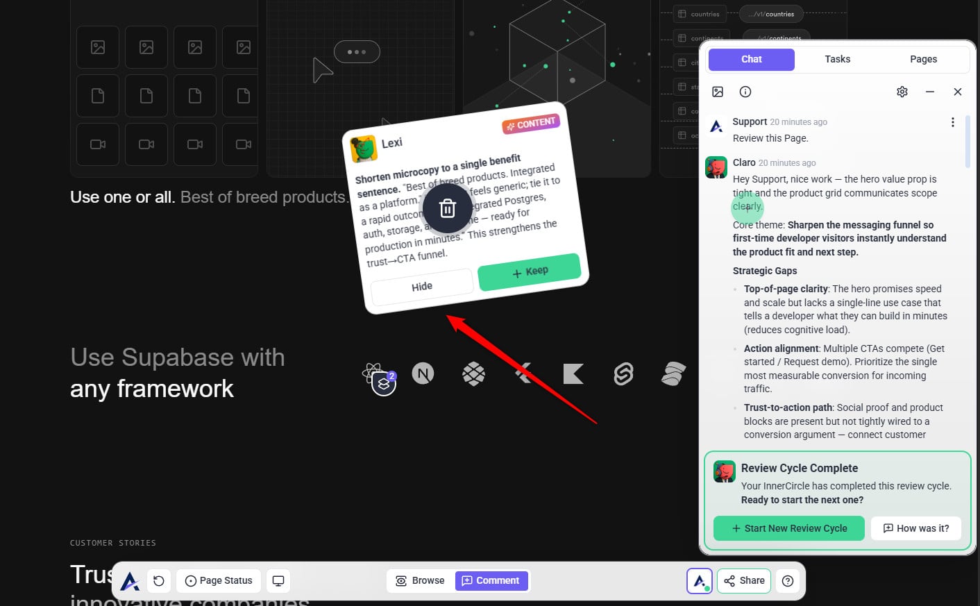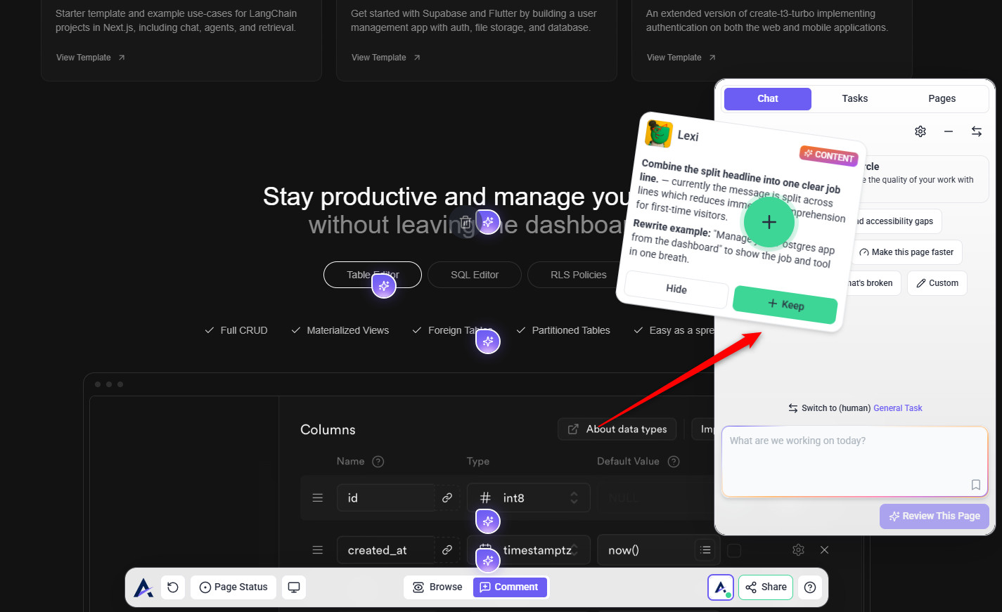Once Lexi’s stickers appear on the page, you’ll need to decide what to do with each one. Think of this as turning her feedback into action (or discarding it if it’s not relevant). Every suggestion can either be kept to use or hidden to dismiss, and important ones can also be converted into tasks for your team.