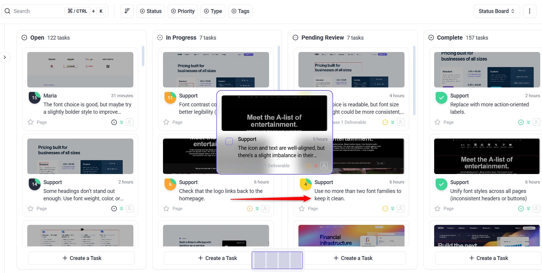 When tasks are ready for client feedback or approval, move them to the Pending Review status. The Pending Review status notifies clients that their input is needed.