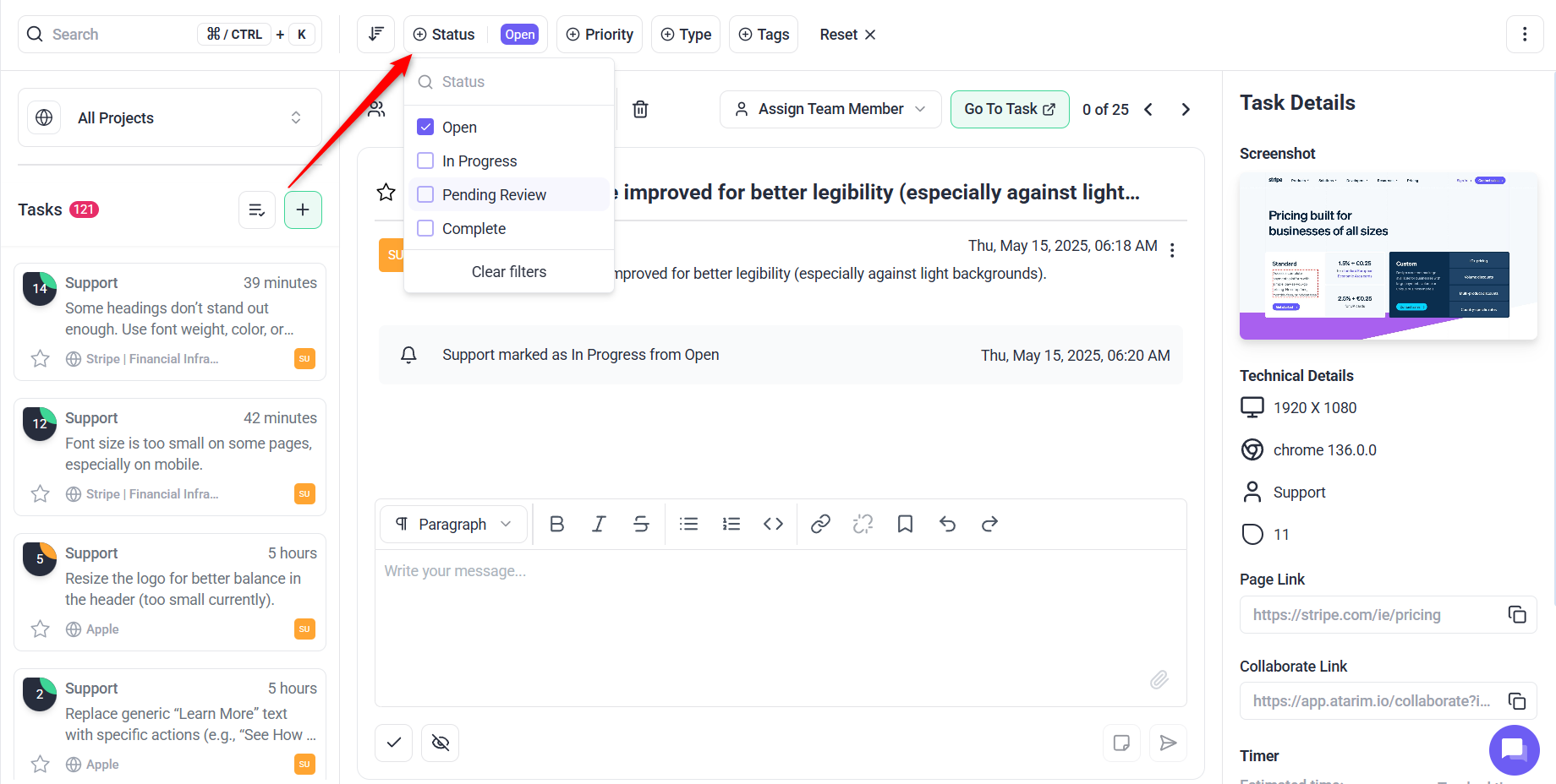 Efficiently manage client feedback with Atarim’s filtering and task management tools.