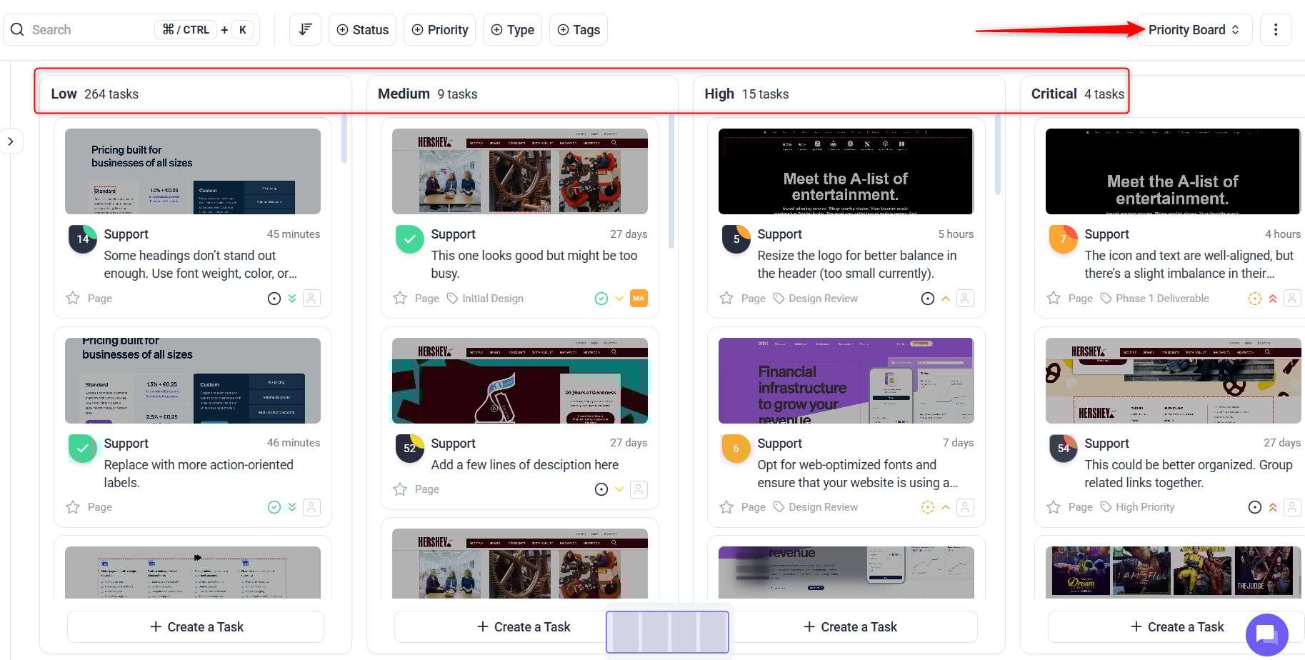 Use filters on the Inbox and Board Pages to sort tasks by urgency and status, starting with Critical items.