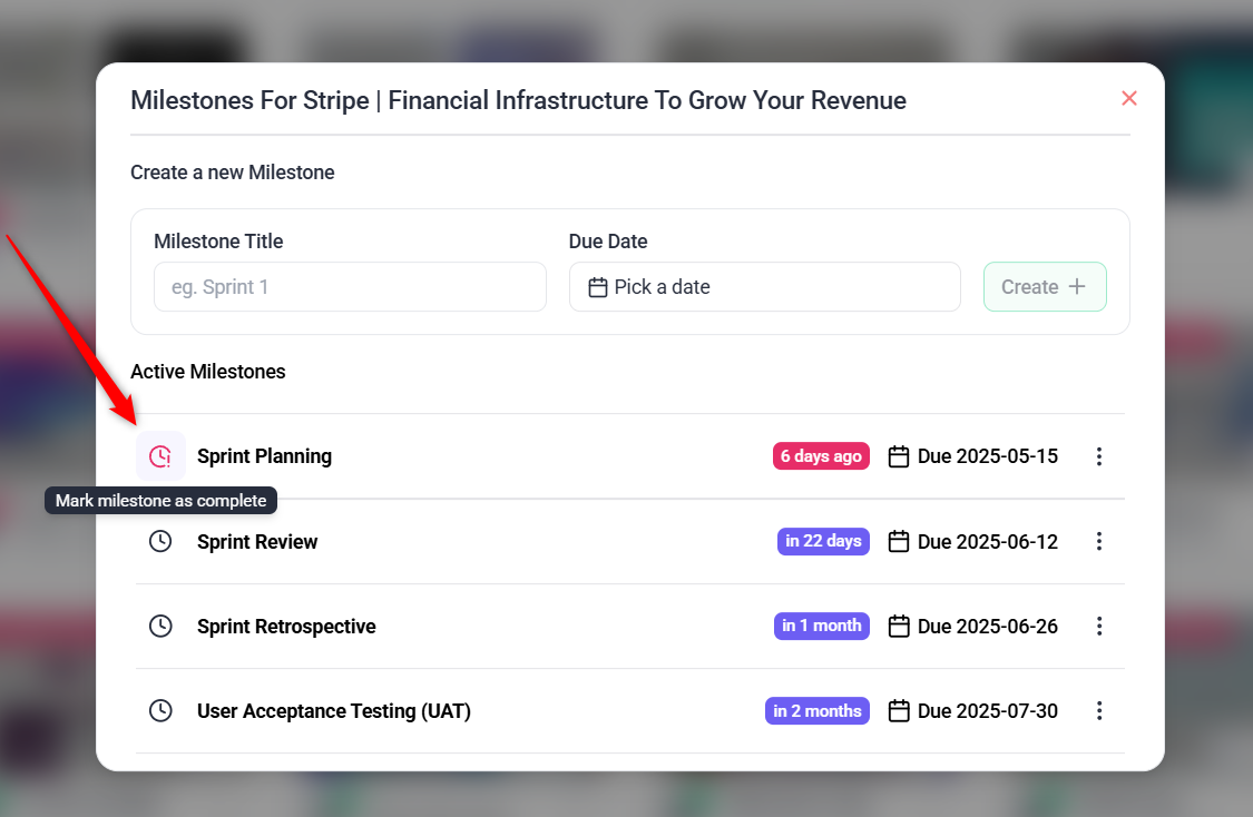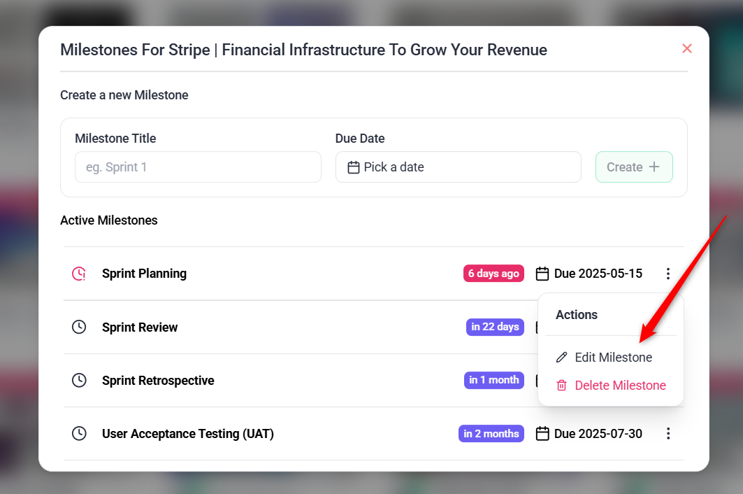 - Client View: Clients see pending milestones, and overdue ones turn red, prompting timely feedback.