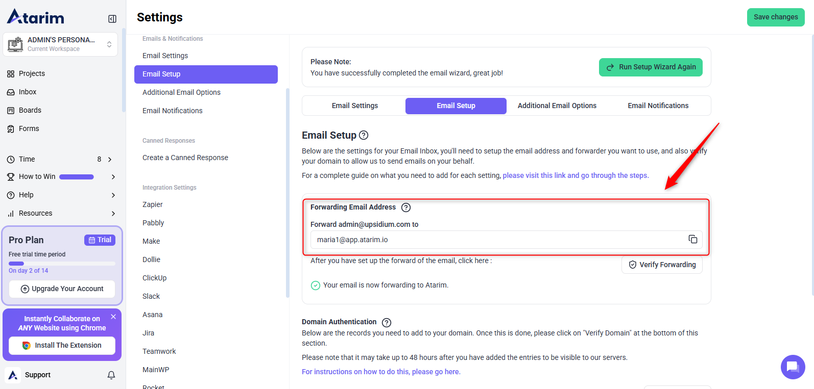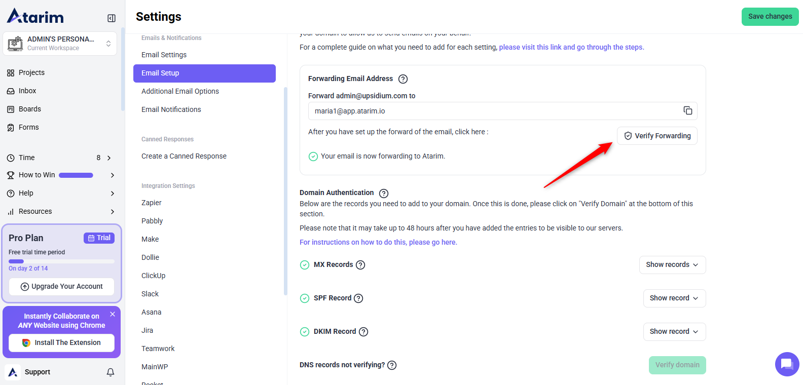 - Save and confirm forwarding by clicking the Verify Forwarding button in Atarim.