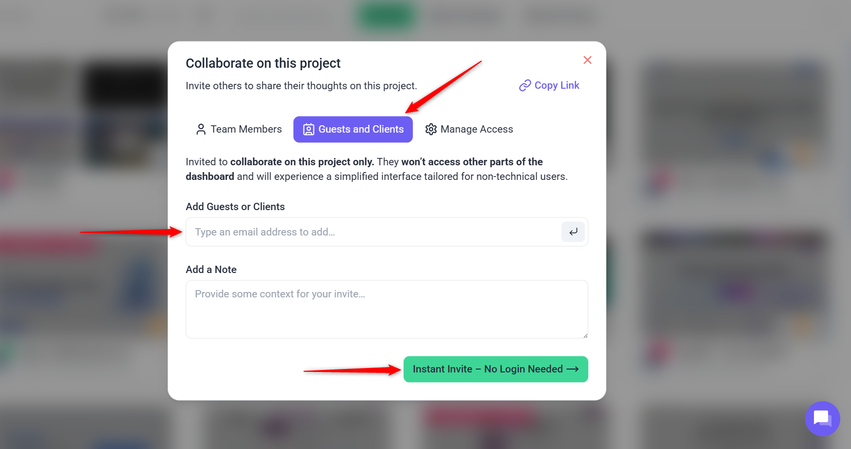 Tip: When inviting clients, let them know they can provide feedback without the need for technical expertise, making it easy for them to participate in the project.