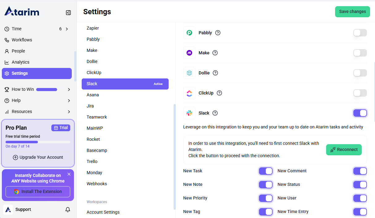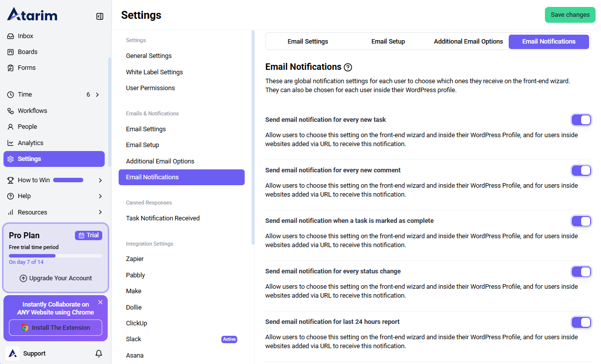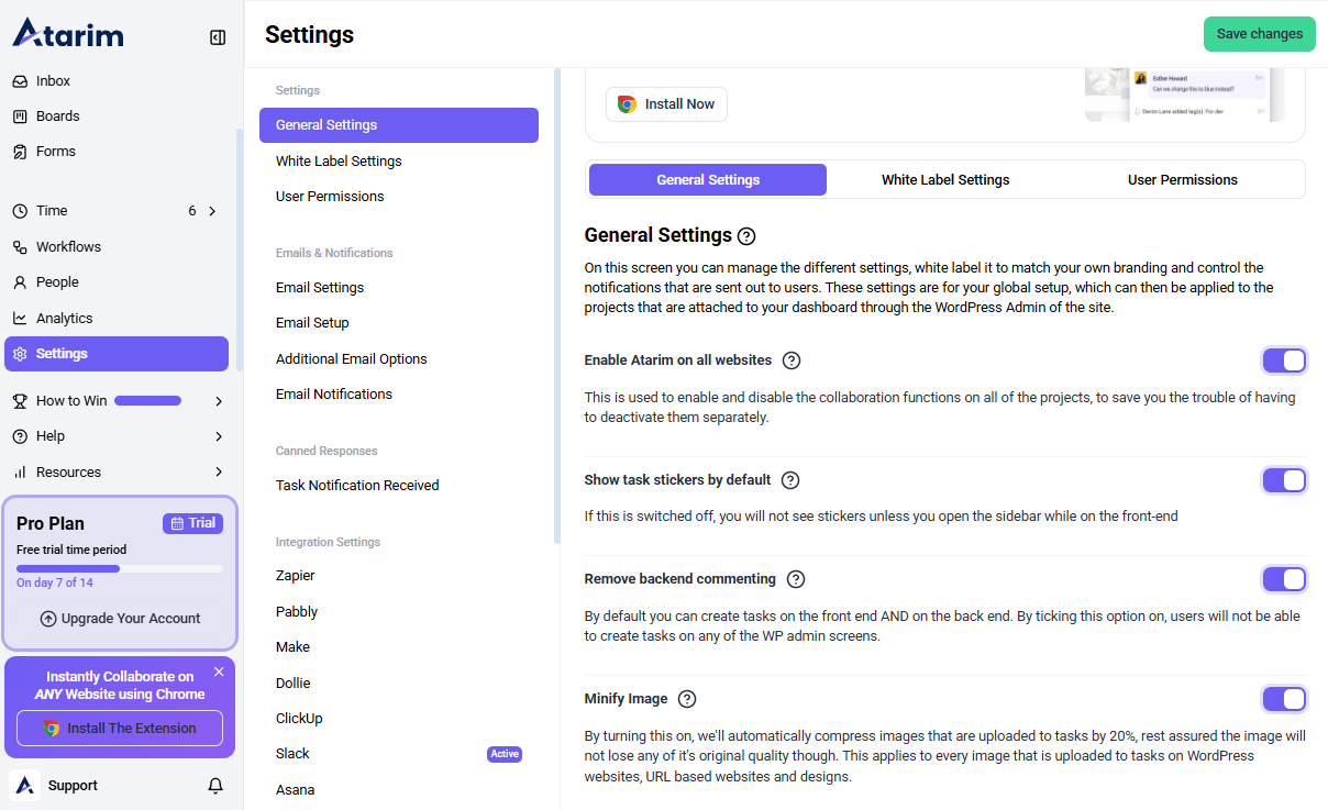 Settings allow you to personalize Atarim’s features, notifications, and integrations.