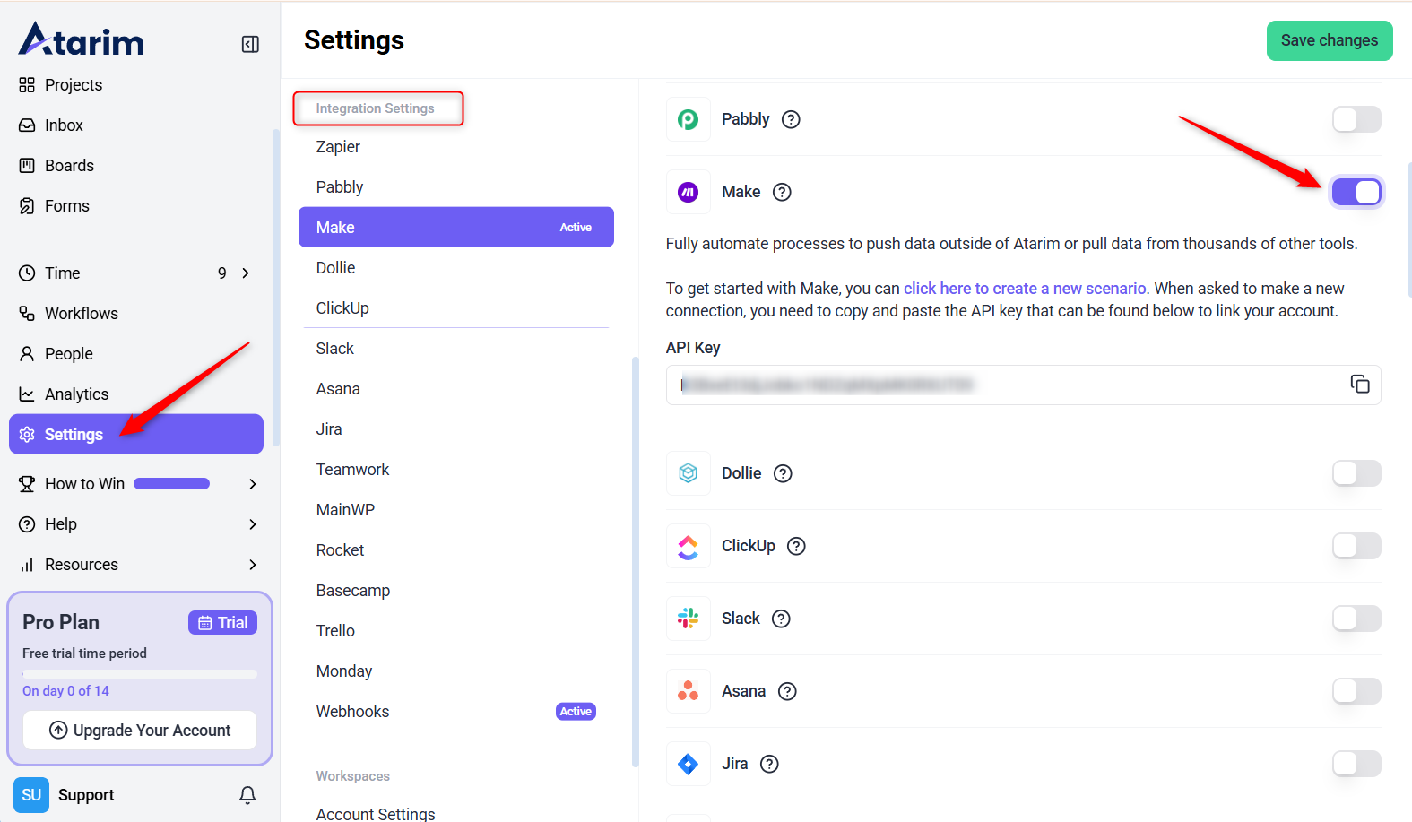 To use Make with Atarim, you’ll need to enable the integration and generate your API key from the Atarim dashboard.