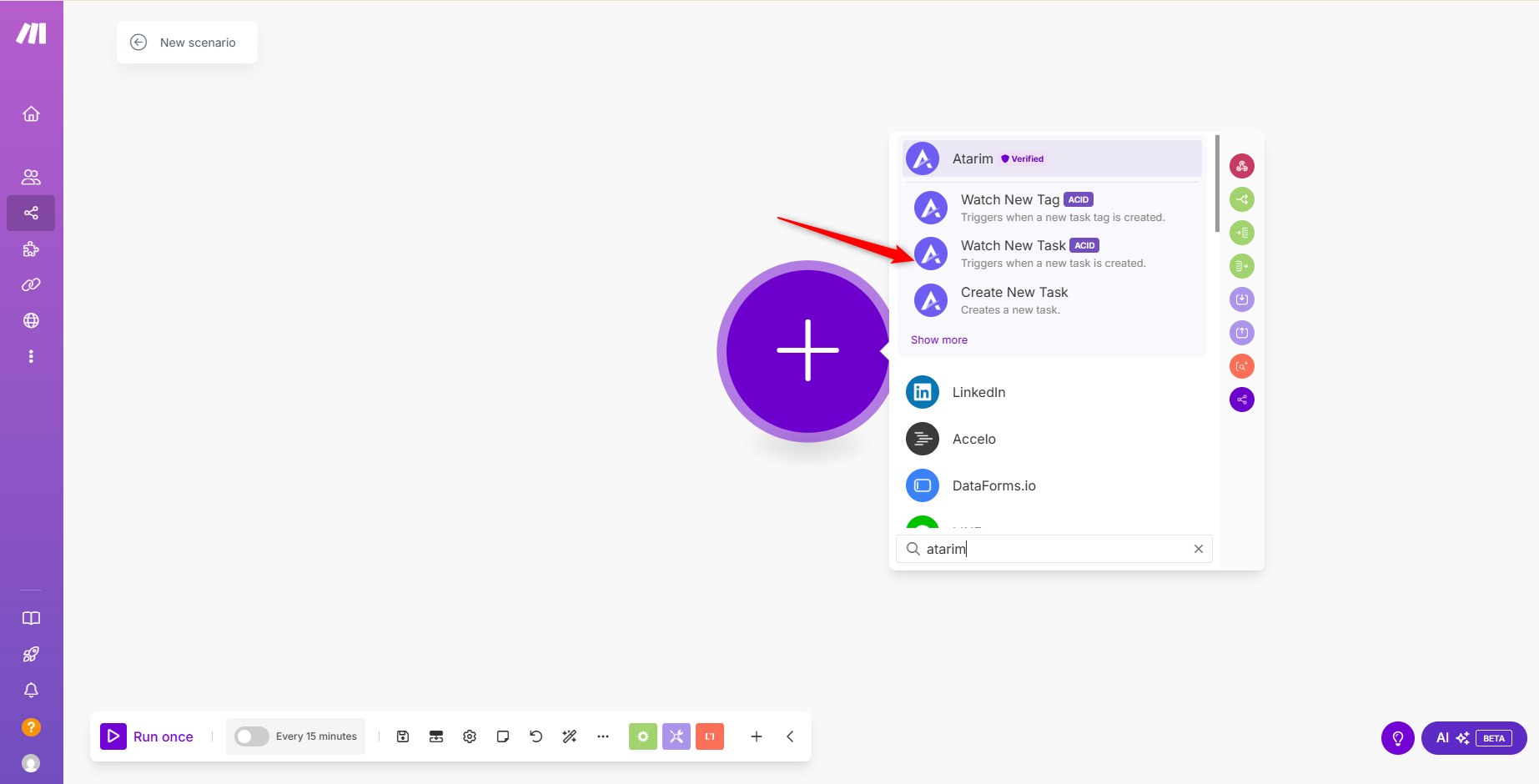 Note: “Watch New Task” is a common starting point. This trigger runs whenever a new task is created in Atarim.