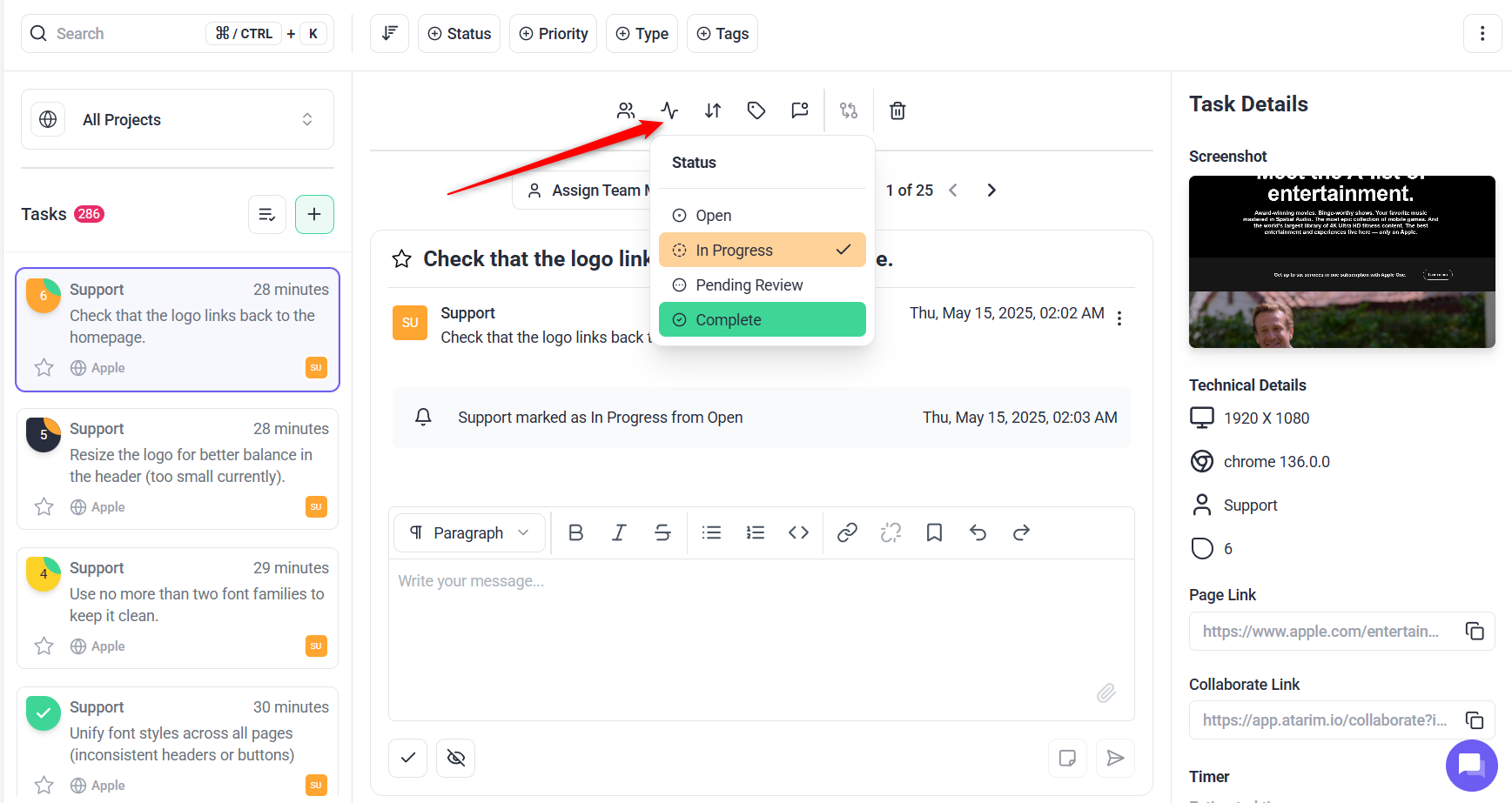 - Change the status to Open, In Progress, Pending Review, or Completed.