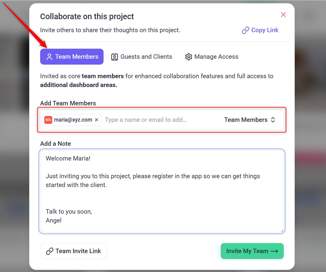 • Invite members via email and assign roles (e.g., Administrator, Collaborator).