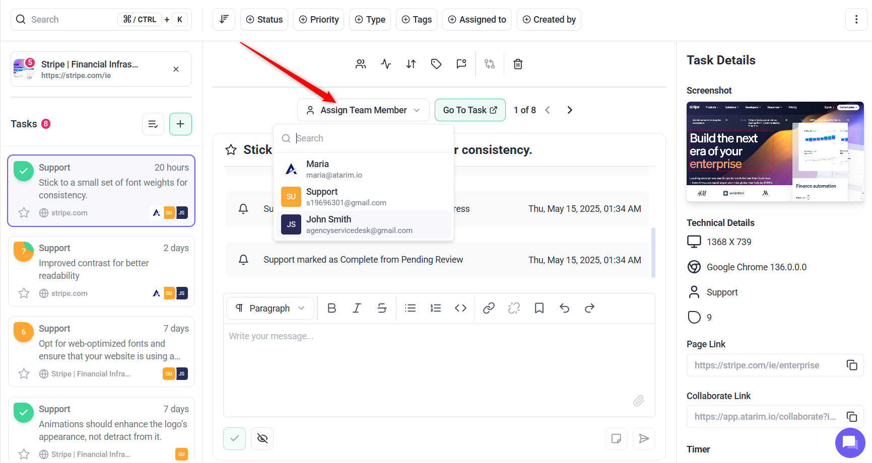 Clear task assignments are key to ensuring accountability and reducing confusion in large teams. Atarim allows you to assign specific tasks to team members and send automatic notifications to keep everyone informed.