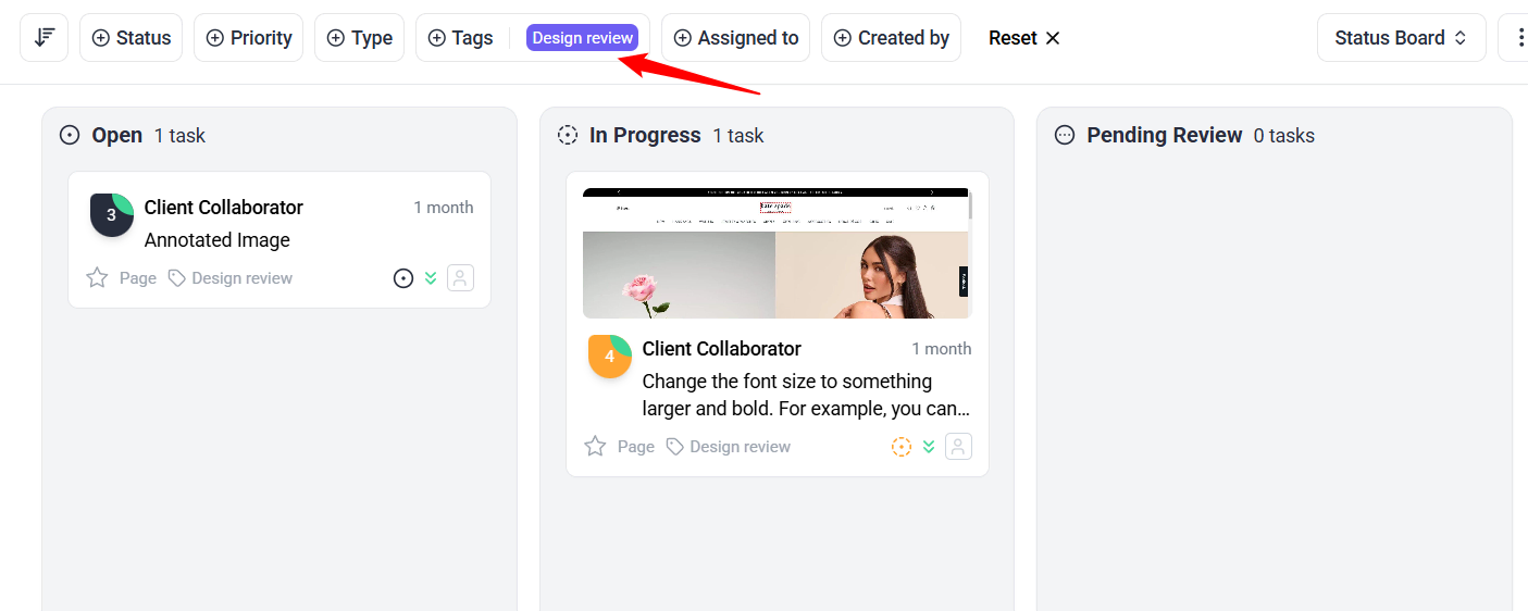 - A QA engineer can filter tasks marked as “Pending Review” to review bugs reported by developers.