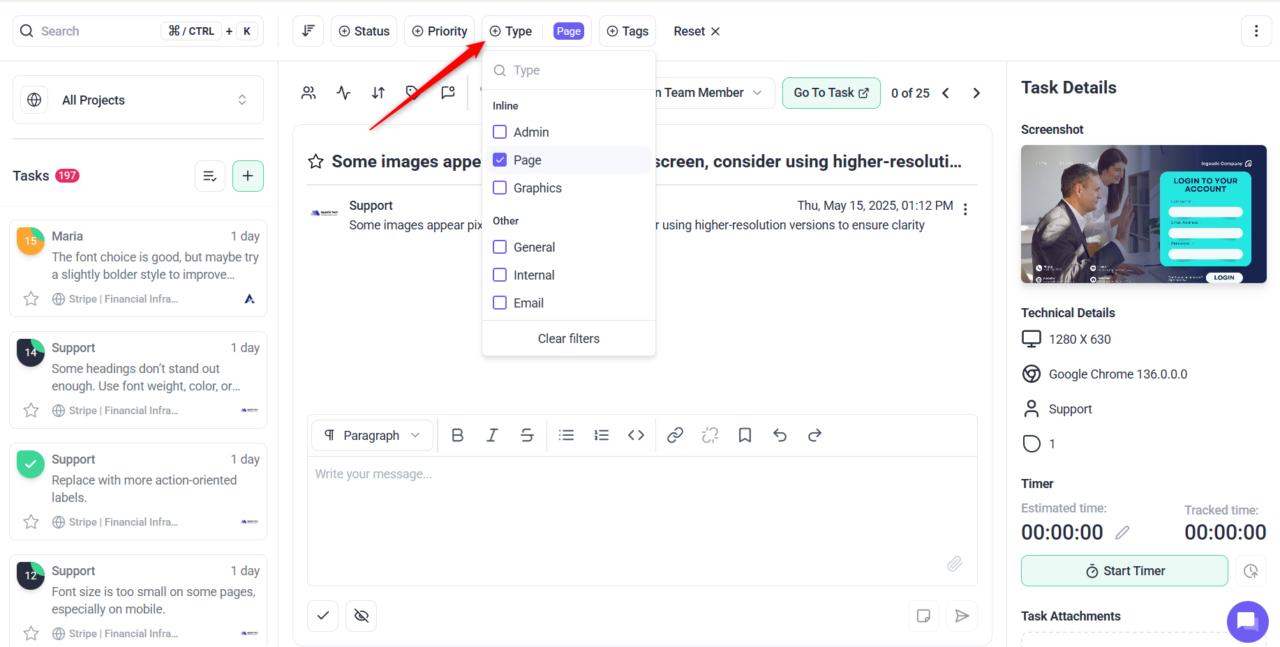 - A frontend developer can filter “Page” tasks to identify areas requiring immediate coding updates.